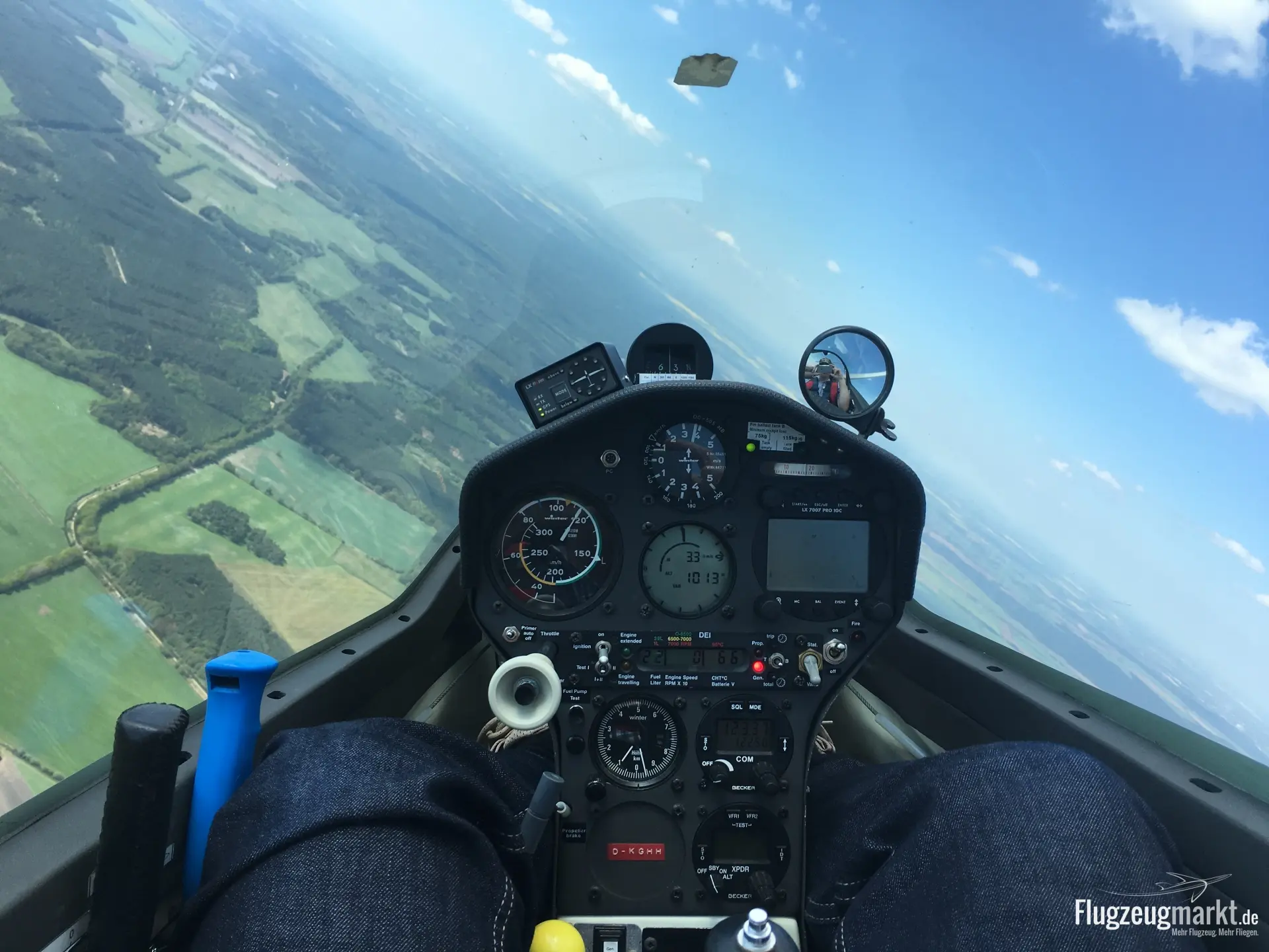 Becker Transponder ATC 4401 mit ACK A30, LX 7007 IGC mit Tochtergerät, Flarm mit Zweitanzeige, ELT, Sauerstoffhalterung mit Flasche, Solarmodule auf der Motorabdeckung, Strobelight auf Rumpf, Bug- und Schwerpunktkupplung, 2 Fallschirme, Allwetterbezüge